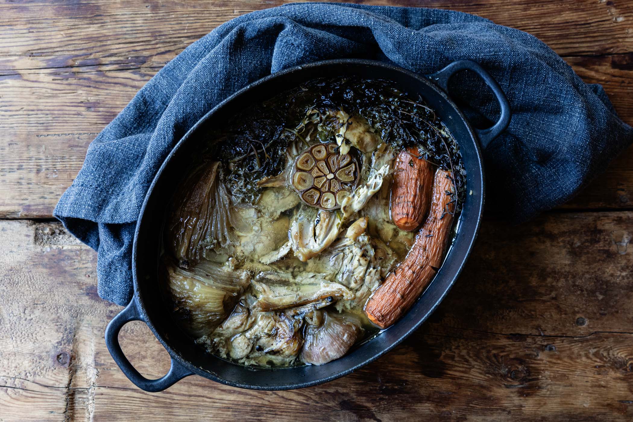 Chef Valentine Warner says that "to throw away the wreckage of a savaged Sunday chicken or indeed a freshly filleted and butchered bird is no less than a crime. Chicken stock or bone broth, whether a brown (roasted) or white (unroasted) is delicious as either sauce bases for both fishes and meats, or restorative in hot and spicy broths or more European broths and thicker soups.